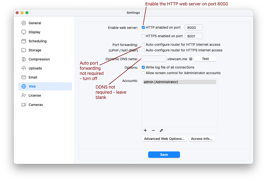 To configure SecuritySpy for use with a virtual network solution, simply enable the HTTP web server and add a user account to provide password protection, like this: