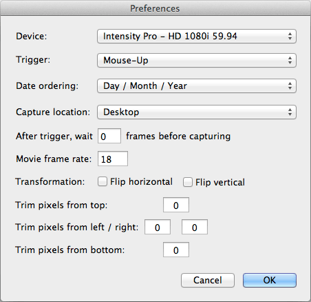 If you have multiple video input devices connected to your computer, you can choose the one you want to use from the Preferences window, which you access from the CaptureMate HD menu: